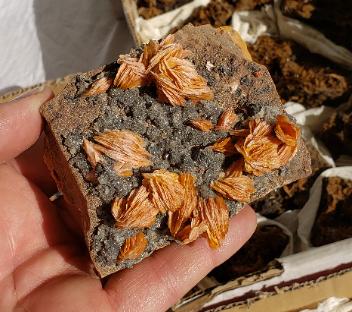 | This year there was some exceptional material from Morocco. There was some really nice specimens that had complex galena crystals with a coating of druze cerussite that sparkles like crazy. These also had bladed barites that ranged from white to cream to orange and some were a nice PEACH color! The photos doesn't show the sparkle of the druse. Some had larger cerussite crystals. I also got some single cerussite crystals also. I bought a couple of flats of the cerussite. |